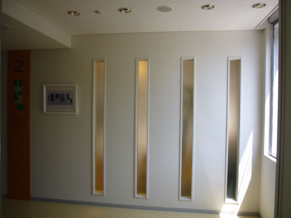 | クリニックの2階です。ほとんど人はいません。今はまだリハビリやっていませんので・・・・。職員がきれいなトイレを使うぐらいです。エレベーターを降りたとき明るいところと暗いところの光の当たり具合が面白いから、撮ってみました。白はやはりきれいですね。 |