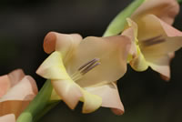 グラジオラスなんです。昨年も撮していますが昨年は黄色と赤のツートンカラーでした。今年咲いたのは去年のうるさいほど咲いていた黄色とは違って、ひっそりと咲いていました。色は肌色みたいに見えました。 |