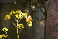 つあぶきを写そうとしたら、蝶が飛んできて蜜を吸っていました。蝶の名前はわかりませんが、もう11月ですから産卵前なのかも知れません。丁度つわぶきに光が当たっていました。 |