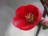 大雪(?)の翌日、木瓜の花が少しだけ咲いていましたが、雪のせいか花びらが傷んでいました。焦点を左側のつぼみにしました。本来はもっときれいな花なんですが・・・・。 |